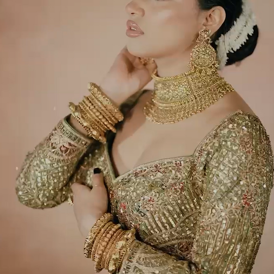 This champagne bridal lehenga with intricate handwork, radiating premium quality and opulence is tailored to perfection. This piece is a tribute to the richness every bride deserves. Customization is our specialty - let your bridal vision come to life.